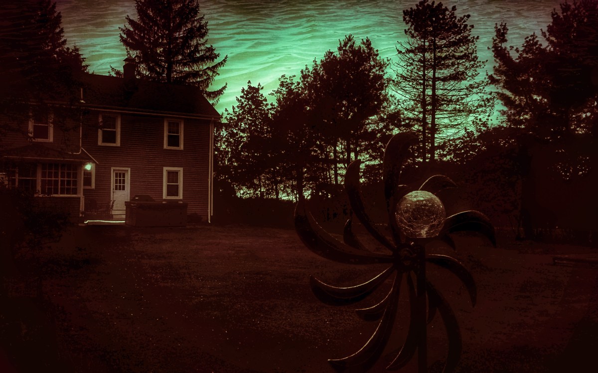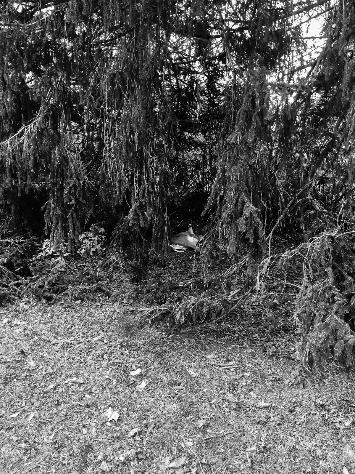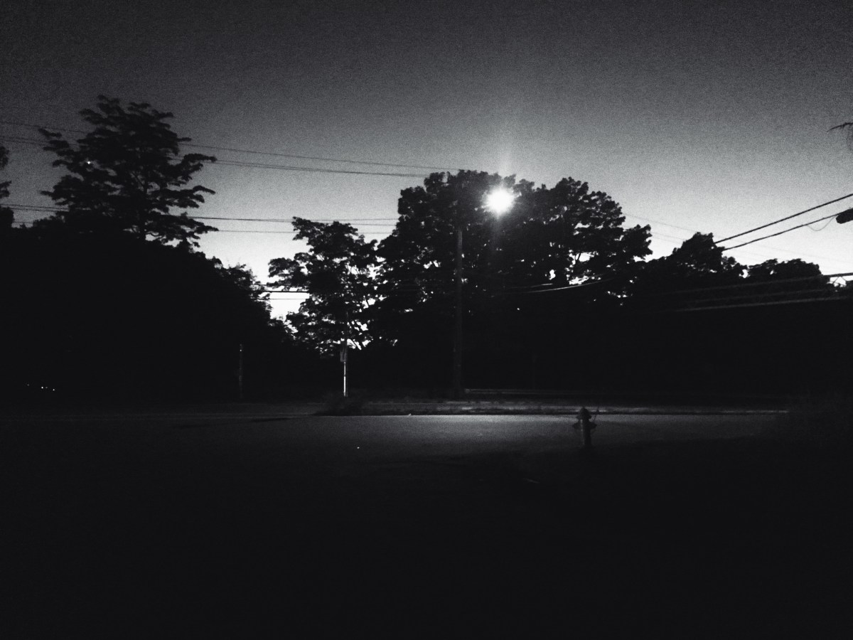 Even now, my thinking takes over. I stop and just wait, the expanse of the green before me. The backyard trees form a dark canopy gently lit by the dim moon. Just enough to see directly in front of me. Then something from the far right corner comes into view.