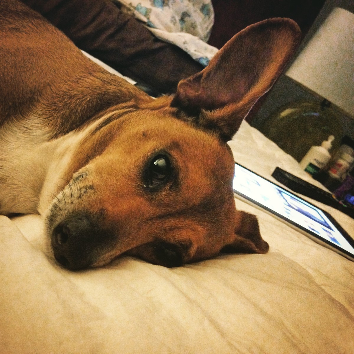 He reminds me of a mix between Alf from the late 80’s tv show and the Downy Snuggle Bear. There is a new dog and I am 6 years old all over again.
